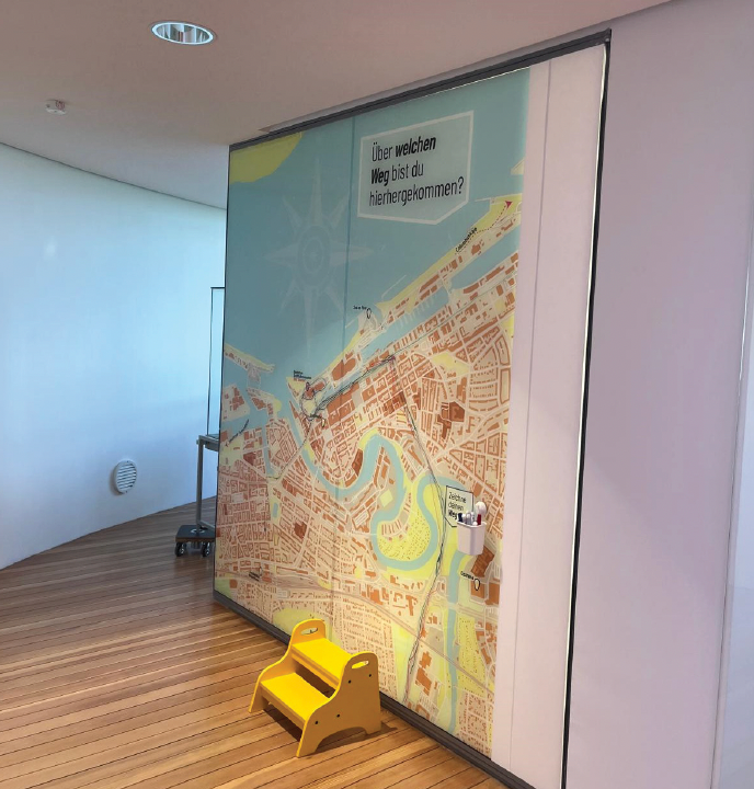 Große Flächen wurden mit Folien beklebt und zwei interaktive Karten als Intro, sowie Outro in das Thema Navigation regen zum mitmachen an.